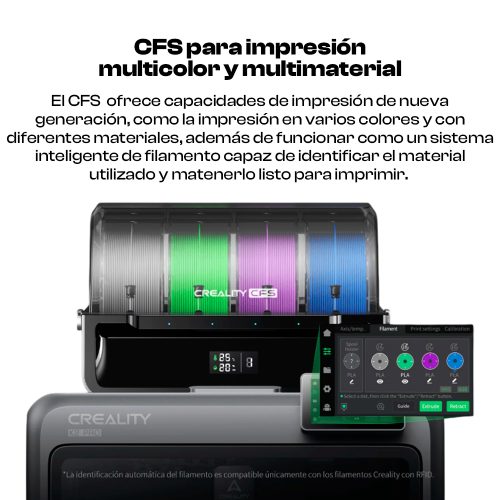 • Impresión multicolor avanzada: el paquete Combo incluye el módulo Creality CFS (Color Filament System) para permitir hasta 16 colores/materiales (hasta 4 módulos CFS instalados).