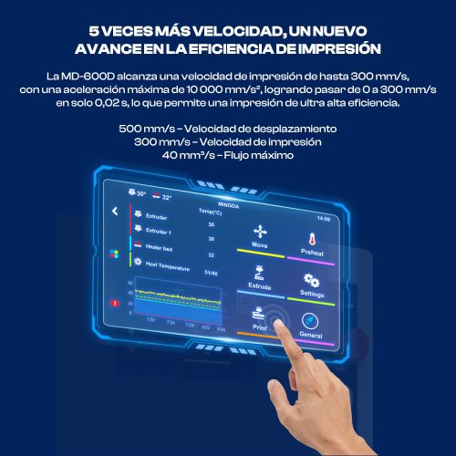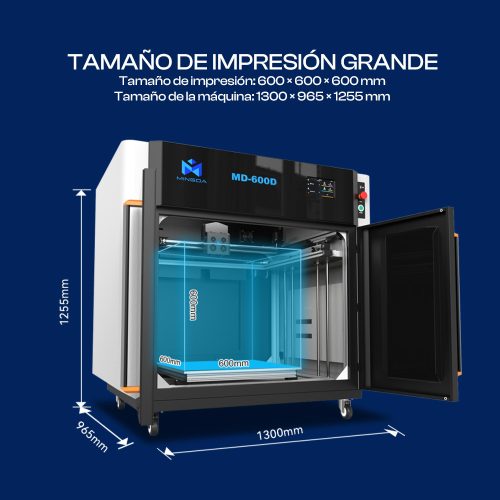 La impresora 3D MD-600D es una potente impresora 3D de nivel profesional con un tamaño de impresión de hasta 600 mm cúbicos. Con su extrusora dual hotend de alta temperatura de 350 grados y sus innovadoras capacidades de impresión rápida, está diseñada para imprimir rápidamente piezas industriales grandes con estructuras complejas utilizando materiales de calidad industrial.