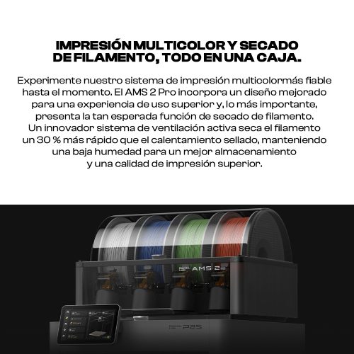 • AMS 2 Pro incluido: permite impresión multicolor y multimaterial automatizada con secado activo del filamento para evitar problemas con la humedad.