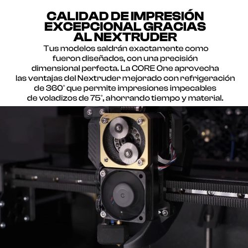 • Extrusor / hotend: “Nextruder” de Prusa (direct-drive) con buen sistema de enfriamiento, compatible con materiales exigentes