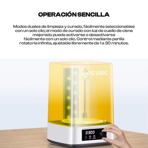 Ofrece modos duales de limpieza y curado seleccionables con un clic, con control por perilla rotatoria ajustable de 1 a 30 minutos.