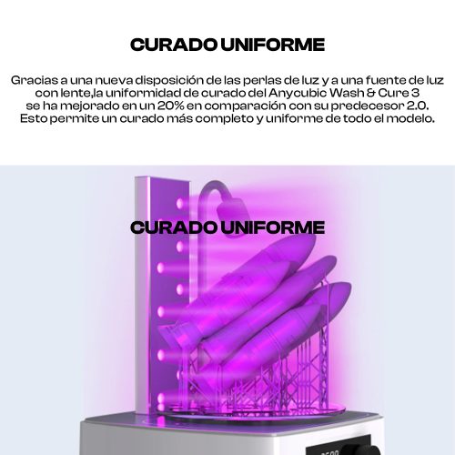 La Wash and Cure 3 es una máquina de postprocesado para impresiones 3D en resina que permite lavar y curar las piezas en un solo equipo, asegurando acabados limpios, resistentes y profesionales. Está diseñada para optimizar el tiempo de trabajo, mejorar la calidad final de las piezas y garantizar un curado uniforme después de la impresión SLA/DLP/LCD.