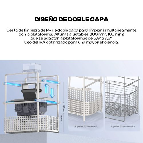 La cesta de limpieza de doble capa (material PP) permite limpiar con la plataforma instalada y maximiza el uso del alcohol isopropílico (IPA) de manera eficiente.